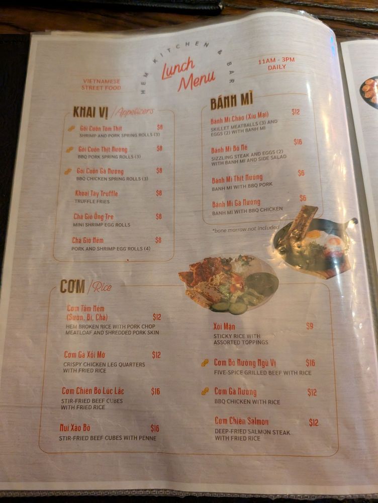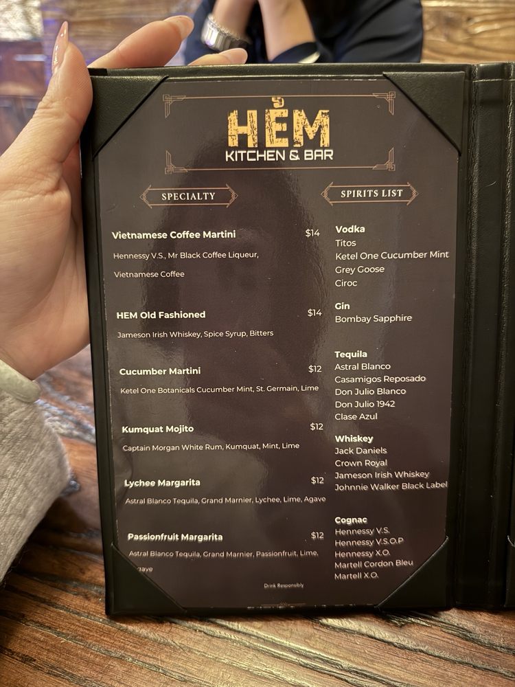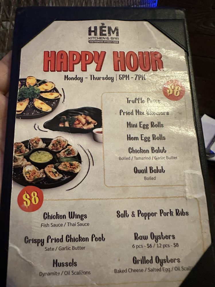 HEM Kitchen and Bar is a trendy, Asian-owned establishment located in Houston, Texas. This bar and seafood restaurant offers a diverse menu featuring Vietnamese cuisine. With a focus on providing a unique dining experience, HEM Kitchen and Bar emphasizes accessibility with takeout, delivery, and reservation options. Catering to a wide range of preferences, the restaurant offers a variety of amenities including outdoor seating, a full bar, and even heated outdoor seating. The menu boasts a selection of dishes perfect for dinner, with happy hour specials available on weekends. As a reviewer, I appreciate the attention to detail in providing ADA-compliant facilities and the option for QR code menus. Overall, HEM Kitchen and Bar's ambiance and menu offerings make it a must-visit spot for those looking for a classy yet casual dining experience.